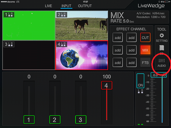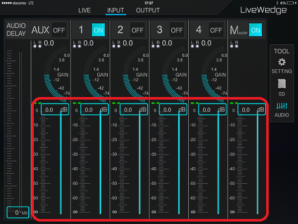 - 音声の有無を設定する場合には各チャンネルおよび Masterの ON/OFF をタップします。ONの状態の時音声が出力されます。